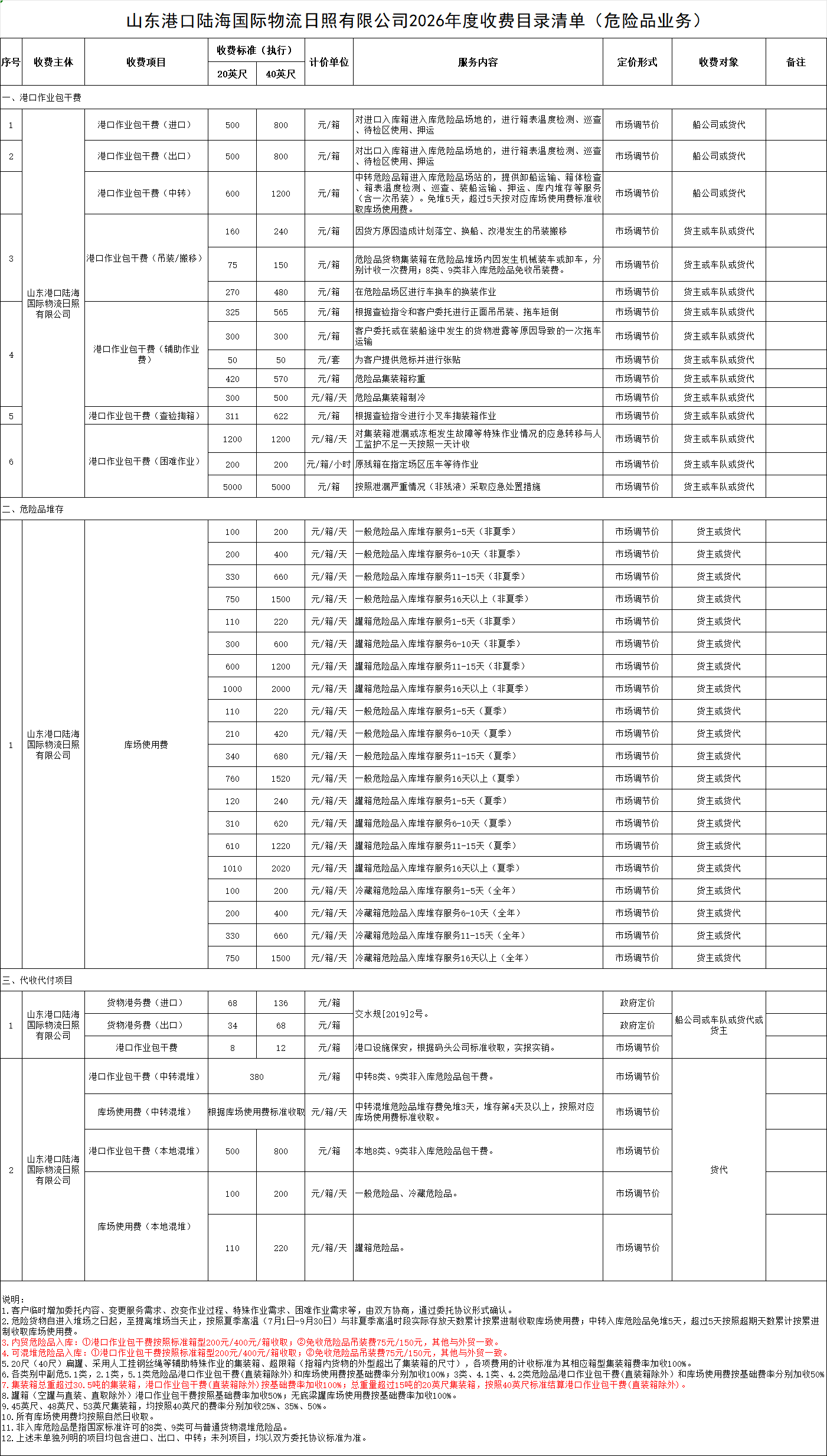 针对青岛、日照进出口危化品,公开明示收费标准或者费率体系。