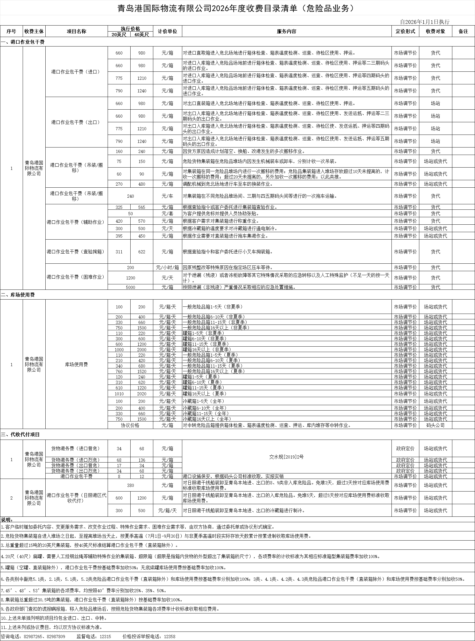 说明:1.客户临时增加委托内容、变更服务需求、改变作业过程、特作业需求、困难作业需求等,由双方协商,通过委托协议形式确认。2. 危险货物自进入堆场之日起,至提离堆场当天止,按照夏季高温(7月1日-9月30日)与非夏季高温时段实际存放天数累计按累进制收取库场使用费;中转入库危险品免堆5天,超过5天按照超期天数累计按累进制收取库场使用费。3.危险品堆存内贸部分:①港口作业包于费按照标准箱型200元/400元/箱收取(加入列表);②免堆期:1-5 天免堆,第6 天起正常收费;③纯收危险品吊装费75元/150元;④其他特殊情况与外贸一致。4.20 尺(40尺)扁罐、采用人工挂钢丝绳等辅助特殊作业的集装箱、超限箱(指箱内货物的外型超出了集装箱的尺寸),各项费用的计收标准为其相应箱型集装箱费率加收 100%。5.罐箱(空罐与直装、直取除外)港口作业包干费按照基础费率加收 50%:无底梁罐库场使用费按基础费率加收 100%6.45英尺、48 英尺、53 英尺集装箱,均按照 40英尺的费率分别加收25%、35%、50%。7.所有库场使用费均按照自然日收取。8.非入库危险品是指国家标准许可的8类、9类可与普通货物混堆危险品。9.上述未单独列明的项目均包含进口、出口、中转;未列项目,均以双方委托协议标准为准。